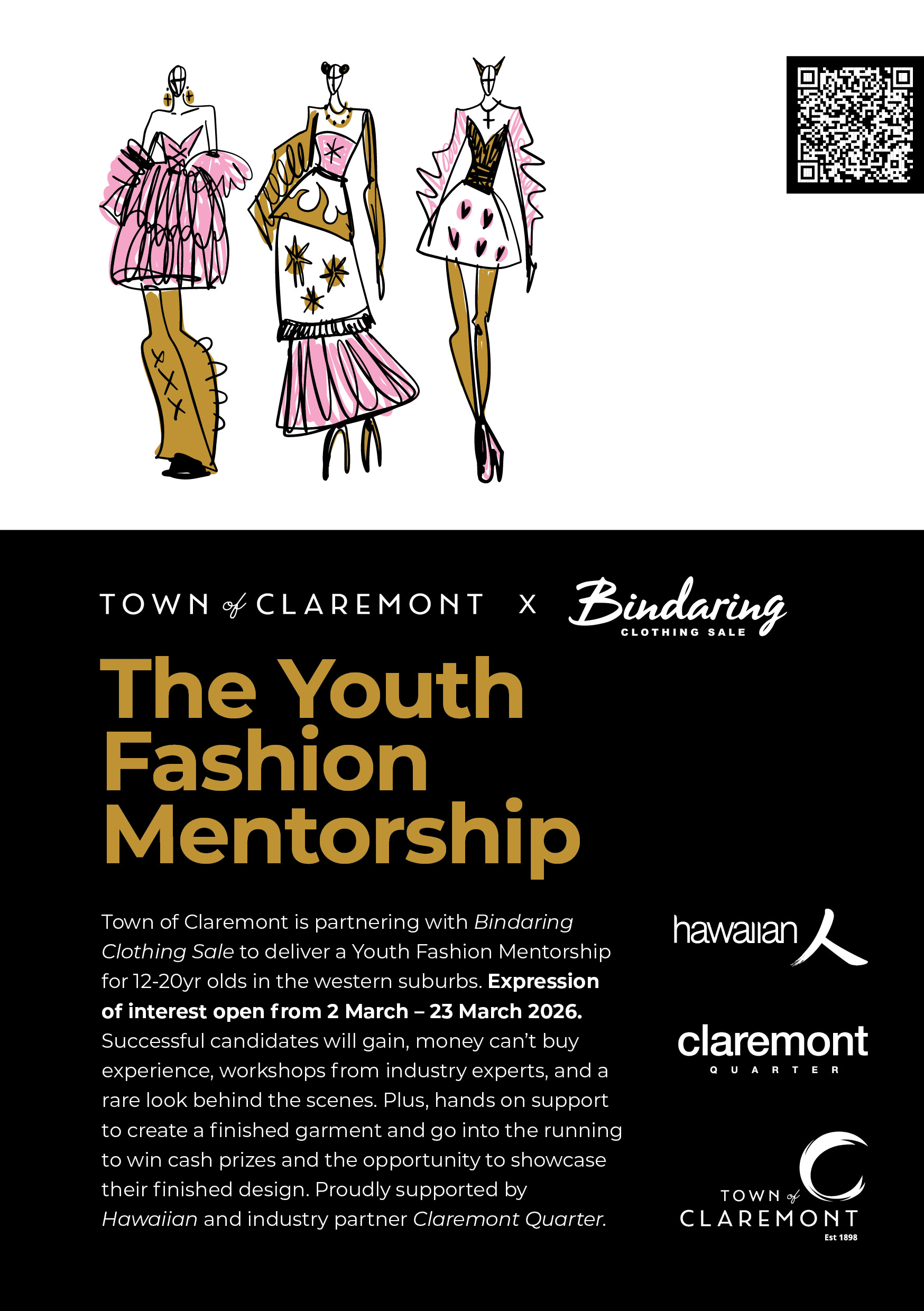 Town of Claremont x Bindaring Youth Fashion Mentorship - Applications open between Monday 2 March 2026 and Monday 23 March 2026.